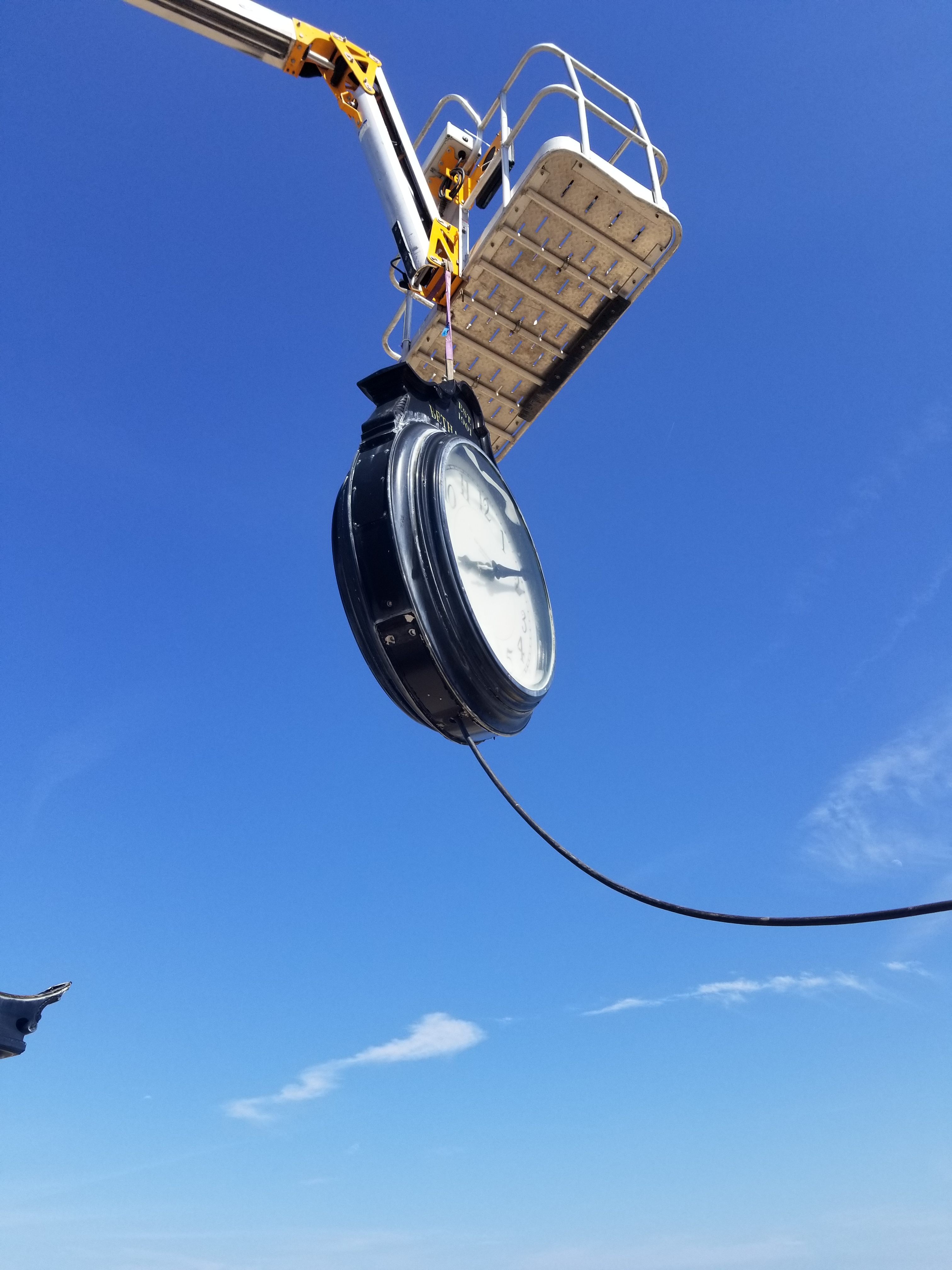 Fourteen years of sun, sand, and salt have taken their toll on the exterior of our boardwalk clock. The clock has been removed and sent back to its manufacturer the Verdin Clock Company of Cincinnati, Ohio to be refurbished. The clock is expected to be back on the boardwalk by mid July.